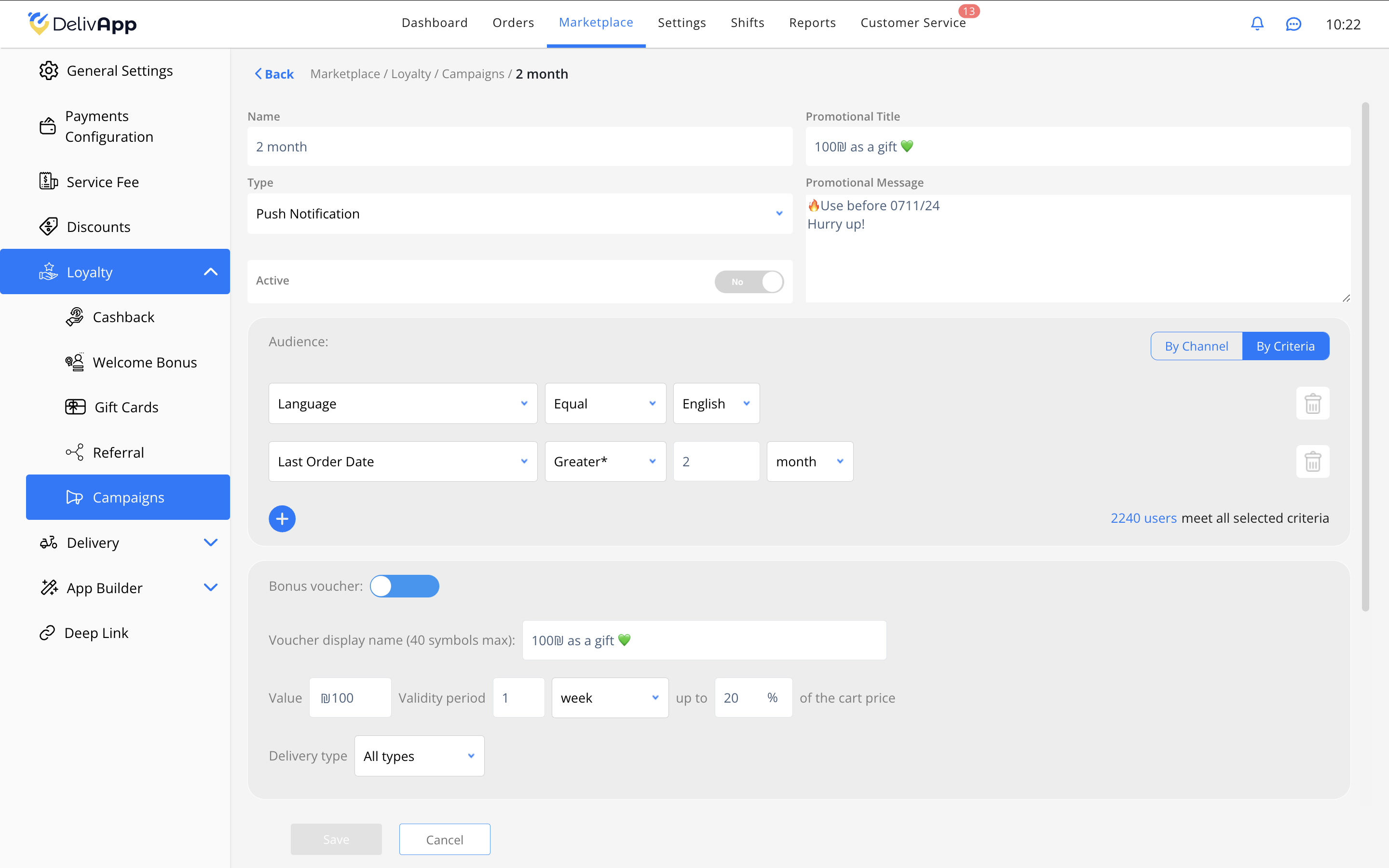 - Open the "Marketplace" tab and select "Loyalty Program" > "Campaigns".