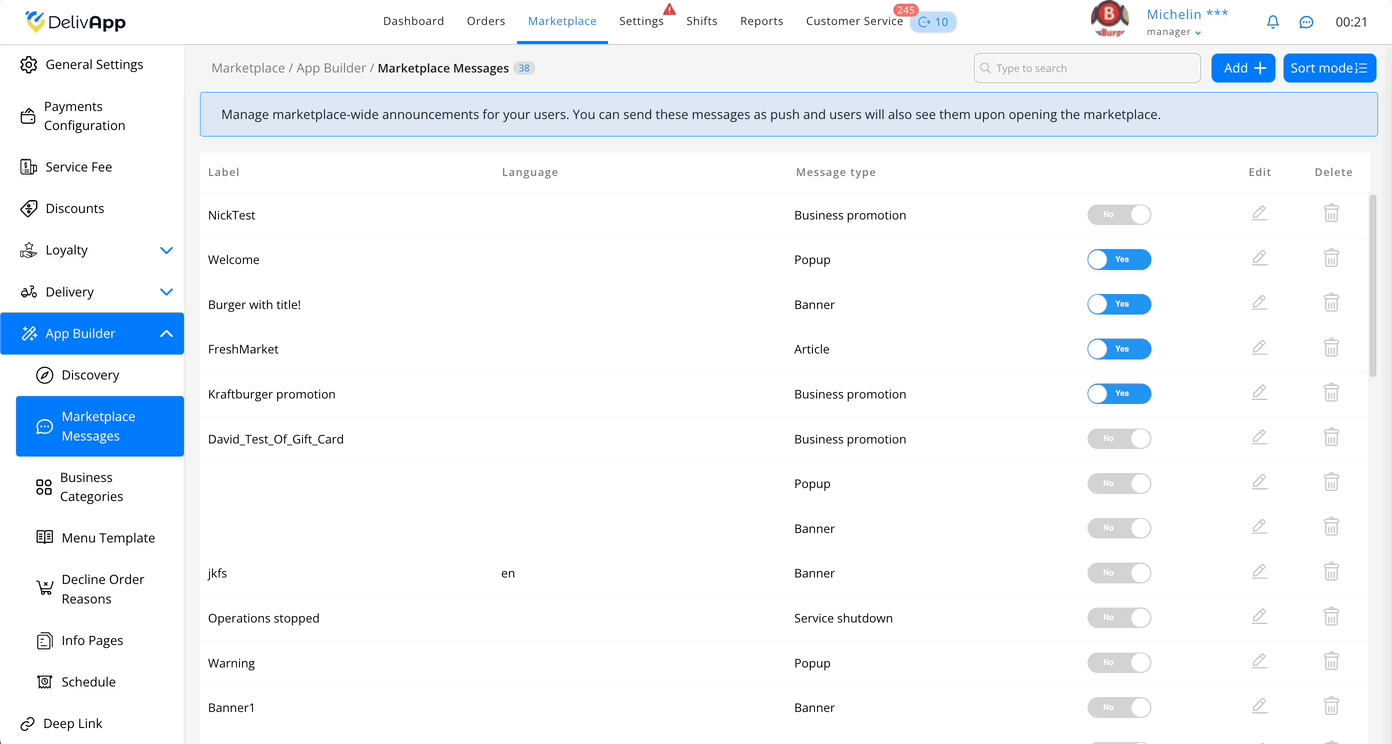 Marketplace Messages – used to create and manage content: banners, articles, alerts, cards with text, links, videos, vouchers, etc. This is where homepage content is created.