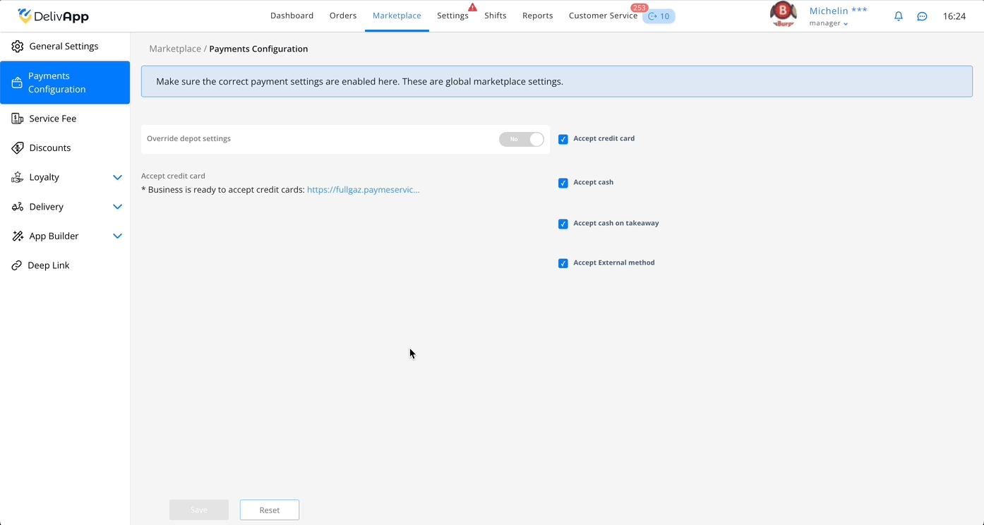 Now you know how to configure payment methods both at the marketplace level and for individual businesses. This enables precise control over how each business receives payments, based on operational needs. If you need help, contact DelivApp Support via the admin panel.