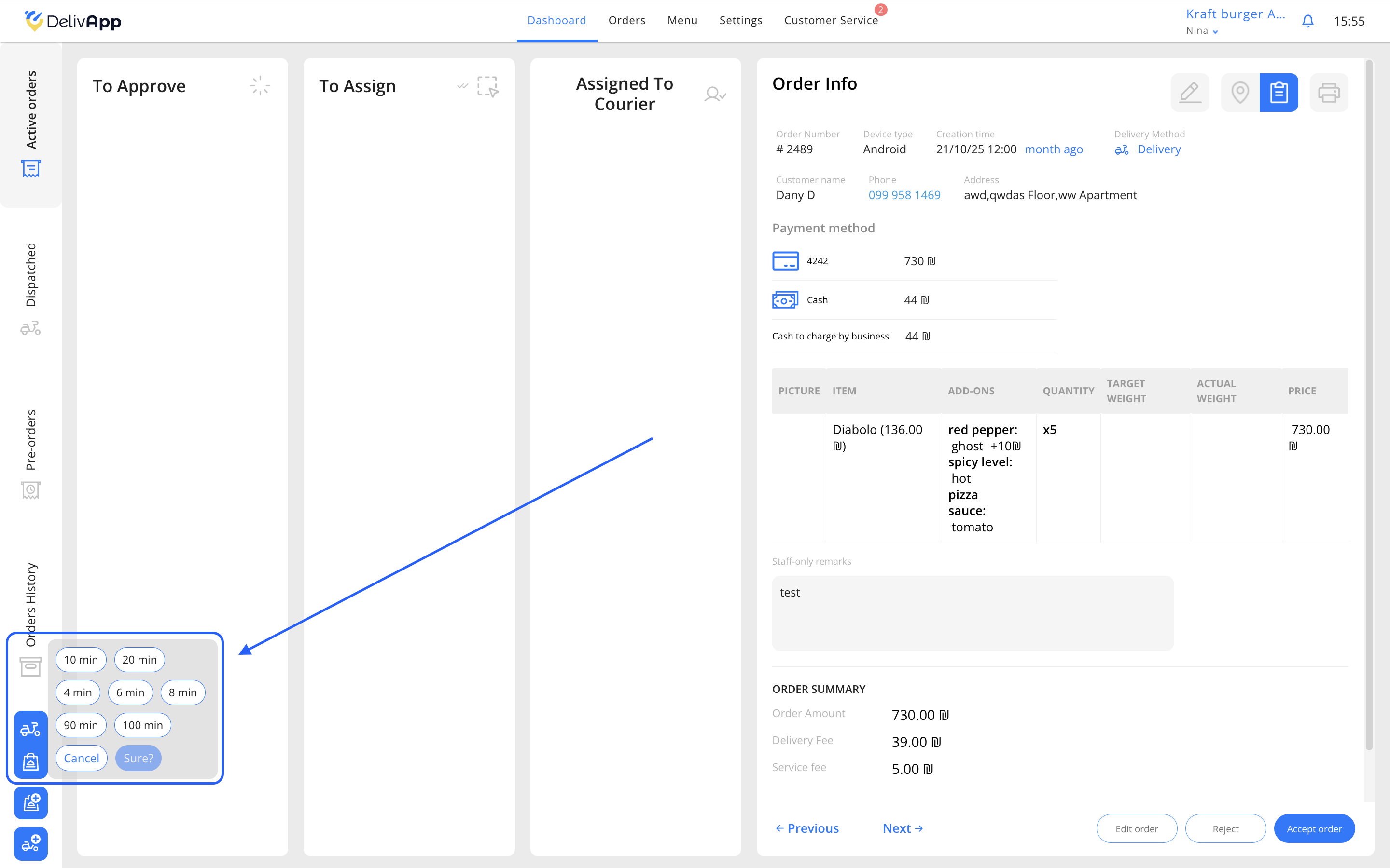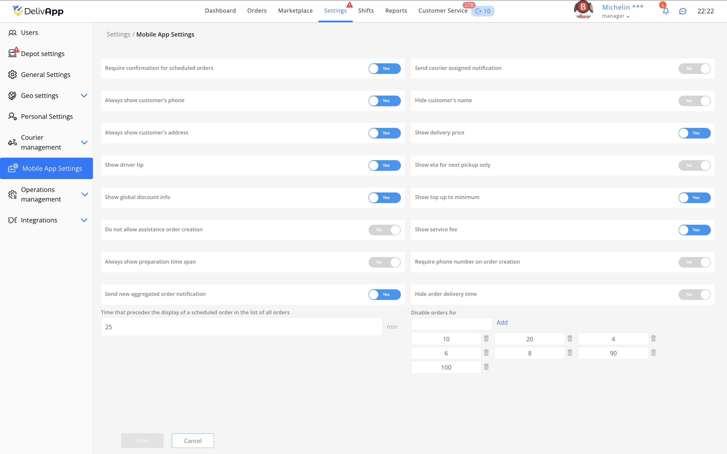 The DelivApp mobile client is a tool designed for managers and business operators, enabling them to receive, view, and process orders directly from tablets or smartphones. The admin panel provides a set of configuration options that allow you to flexibly control the display of information, functionality, and behavior of the mobile client.