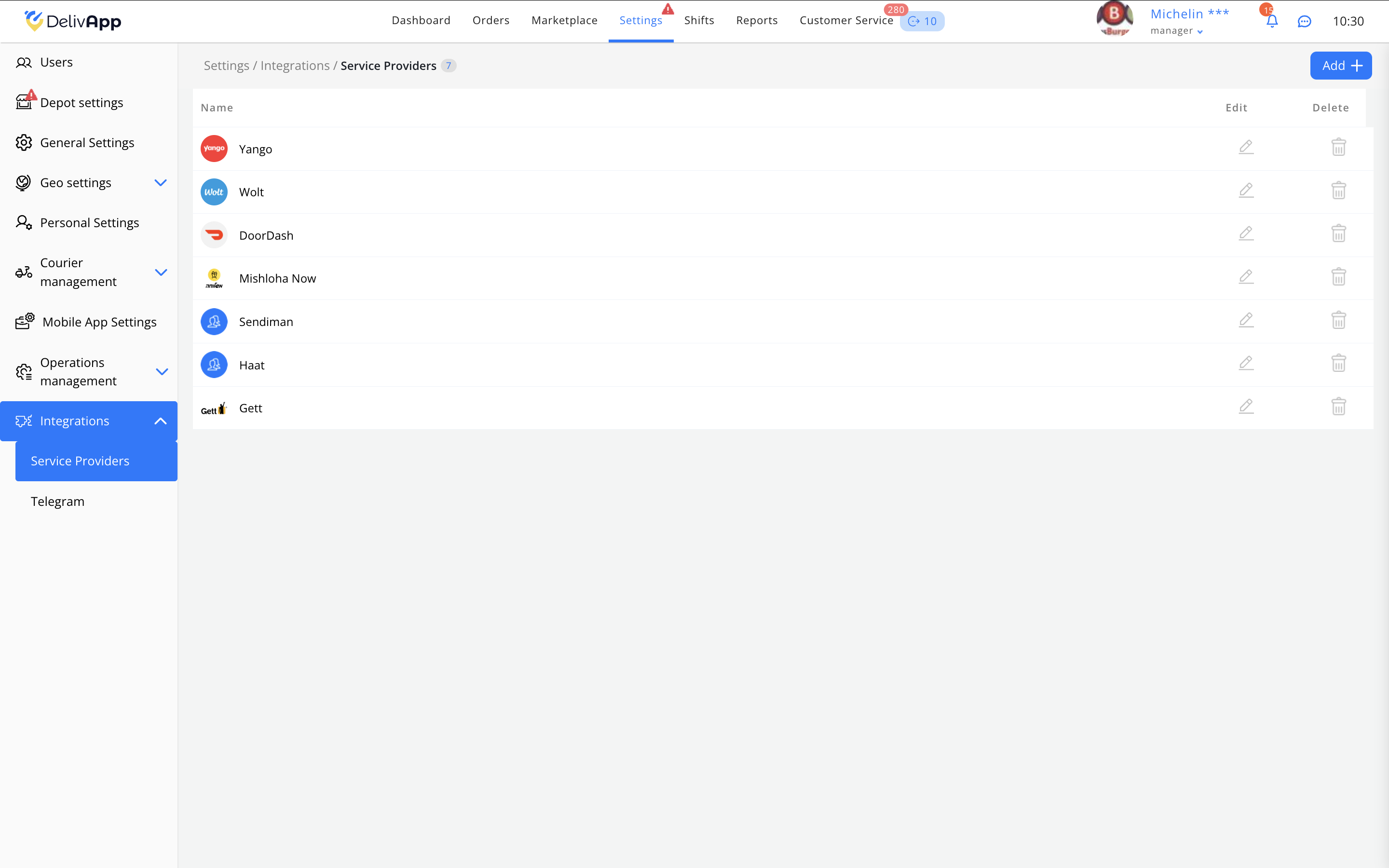 Service Providers — this is where aggregators and external delivery services are connected (such as FullGaz, Yango, Wolt, DoorDash, and others). These providers automatically send orders to DelivApp for further processing by a manager and courier assignment.