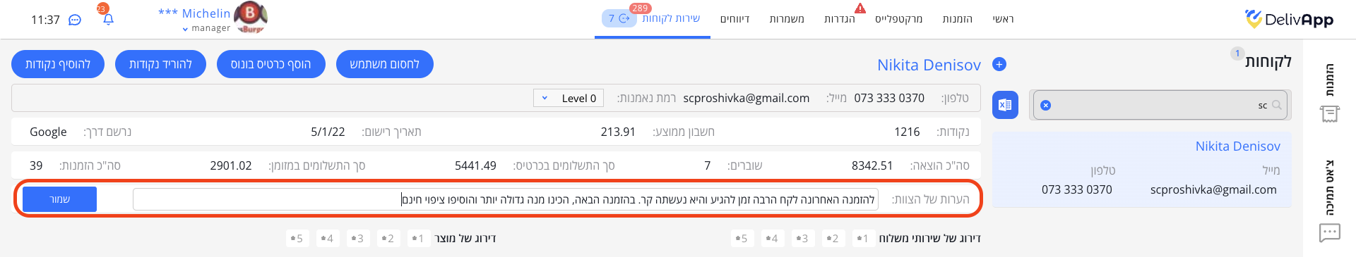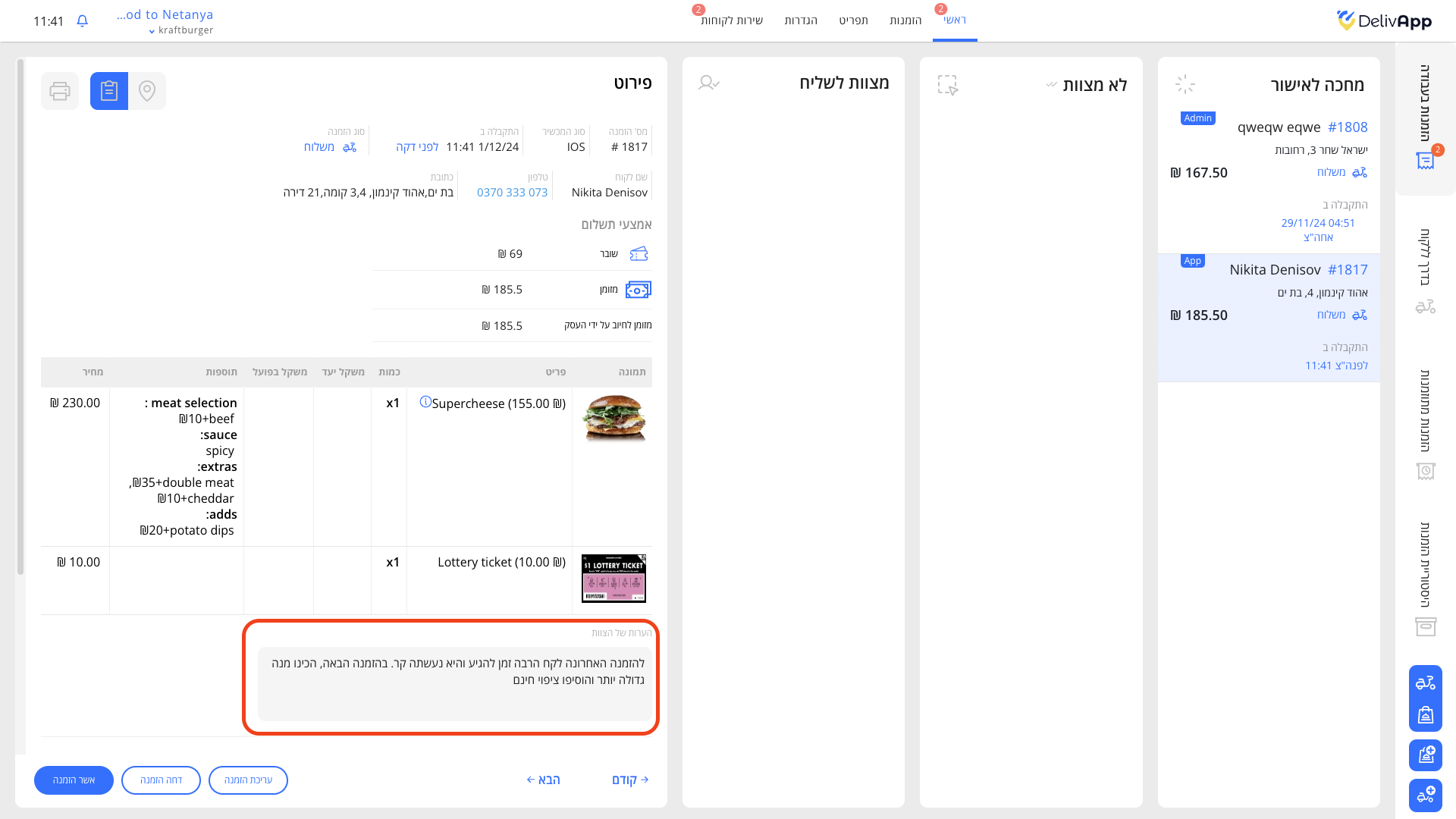 כעת ניתן להשאיר הערות על משתמשים מסוימים בעמוד שירות הלקוחות. הערות אלו נראות לצוות שירות הלקוחות ולמסעדות בלבד. הן מופיעות לצד שמו של המשתמש ונראות בכל פעם שהמשתמש מבצע הזמנה. זה עוזר לסמן לקוחות חשובים או כאלה הידועים כמאתגרים את השירות.