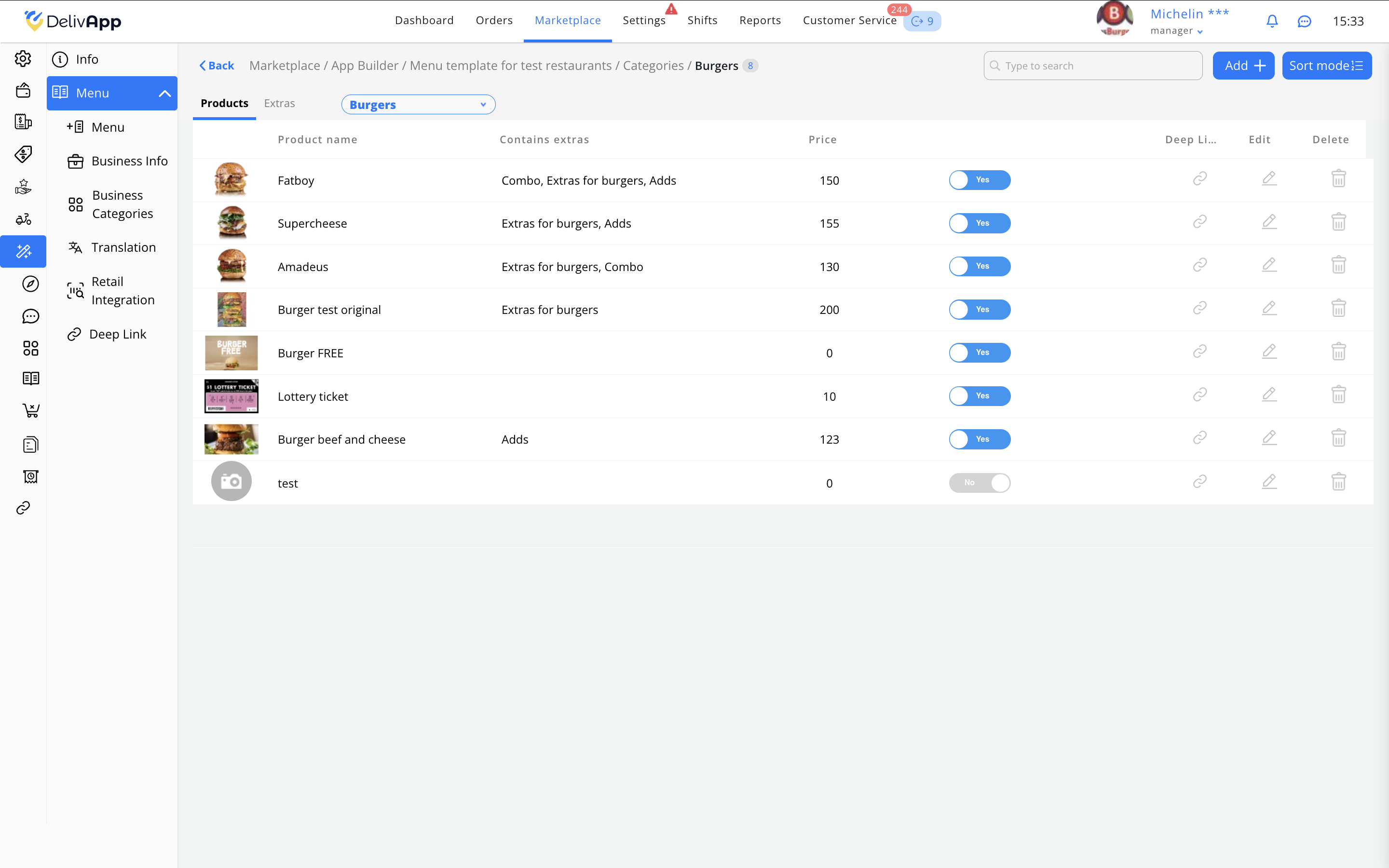 - הפעל קבוצות תוספות רלוונטיות (למשל: Adds, Extras for burgers, Combo) — אם הוגדרו מראש.
