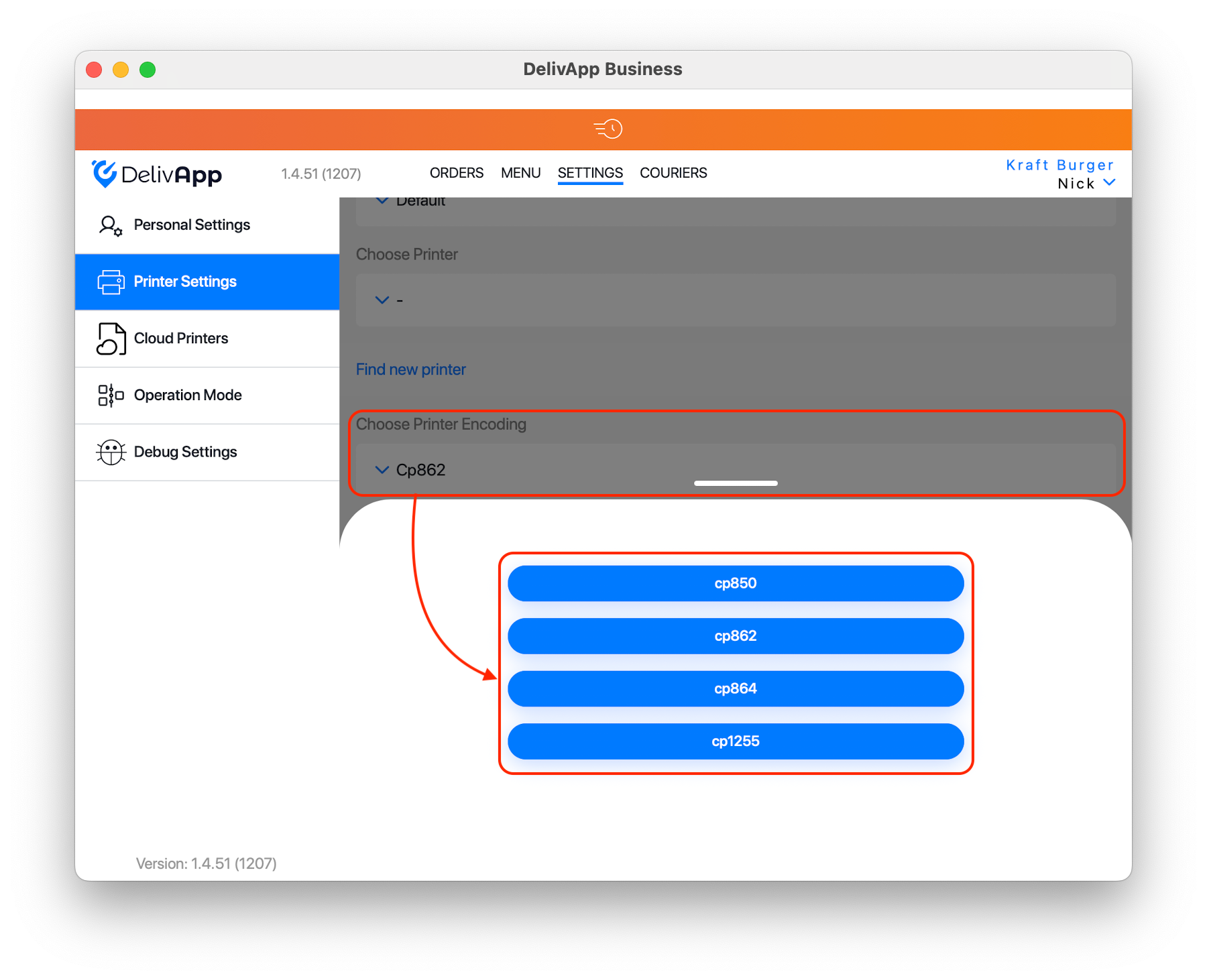 בשדה בחר קידוד של המדפסת, בחרו את הקידוד הרצוי (לדוגמה: cp862 לעברית).