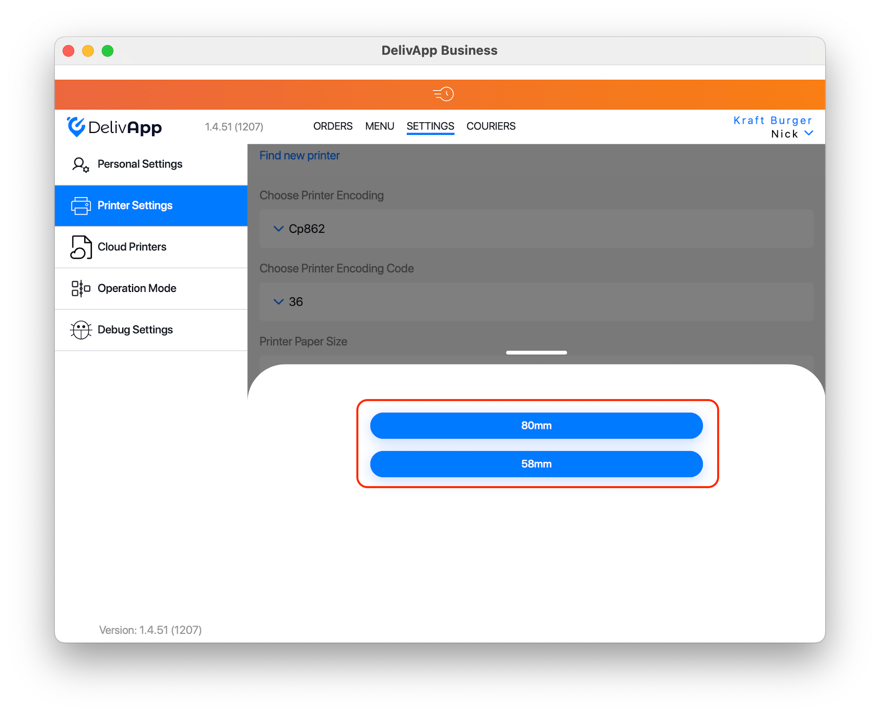בחרו את גודל הנייר שבו המדפסת משתמשת: 80mm או 58mm.