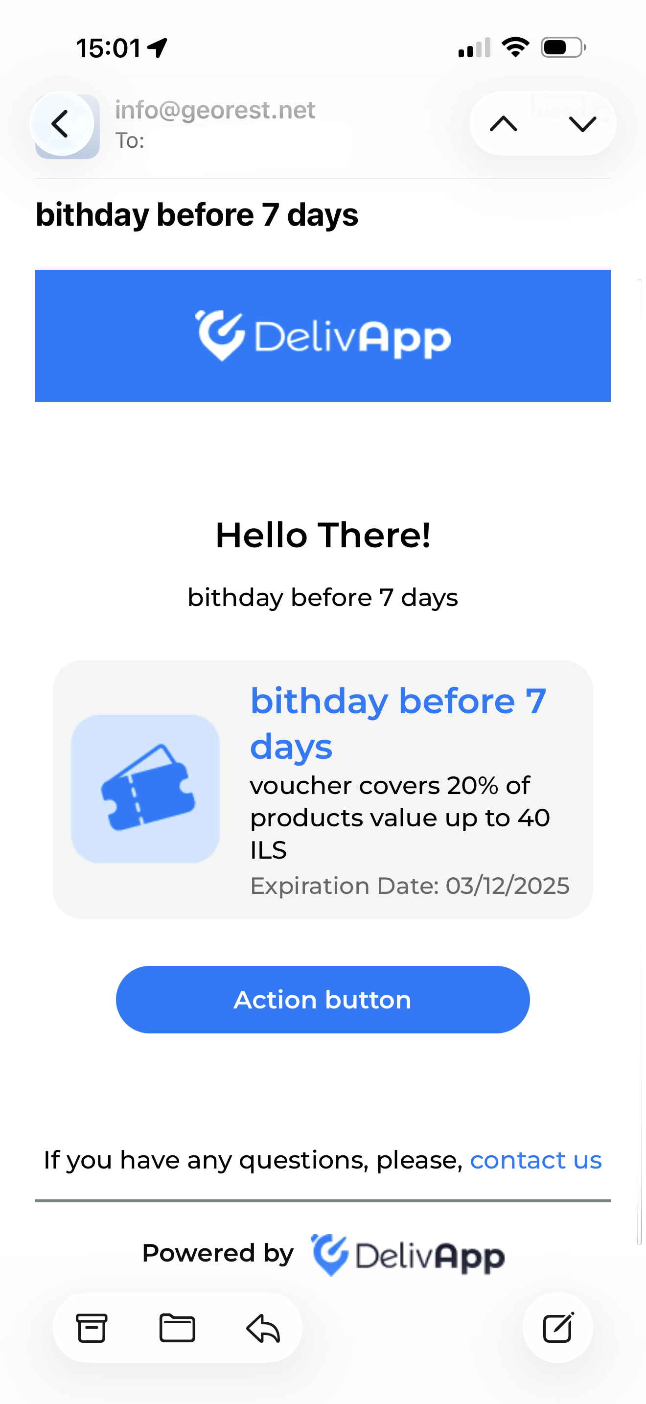 הערה: כאשר סוג הקמפיין מוגדר כ–“אימייל”, הודעת הבדיקה תכלול כפתור פעולה המוצג בהתאם לטקסט שהוזן. יש לוודא שהטקסט משקף בצורה ברורה את הפעולה הרצויה ושהוא מוצג כראוי במכשירים ניידים.
