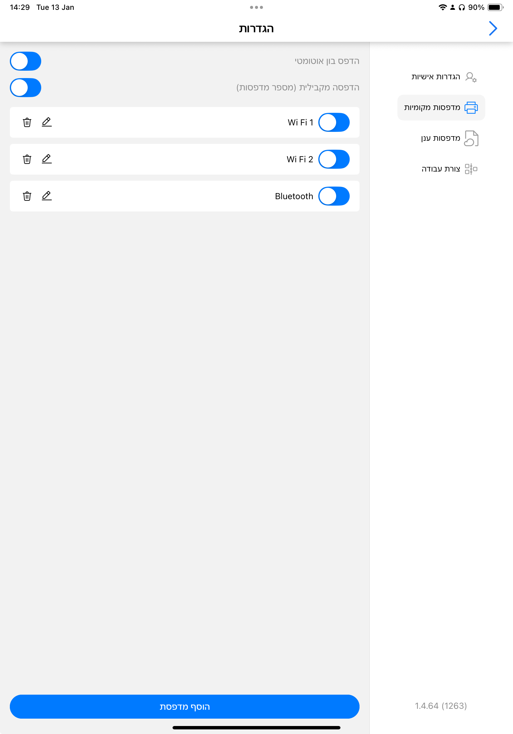 - רשימת המדפסות שכבר נוספו (אם יש כאלה) עם כפתורים לעריכה ולמחיקה, ועם מתג הפעלה/כיבוי, שימושי כאשר המדפסת אינה בשימוש זמני;
