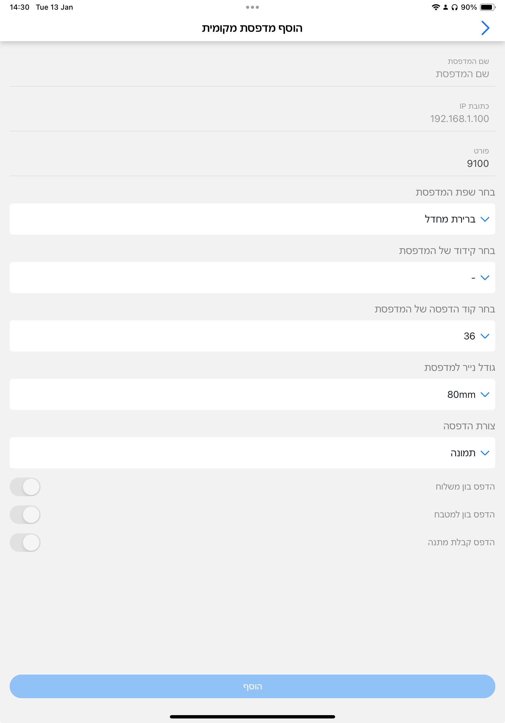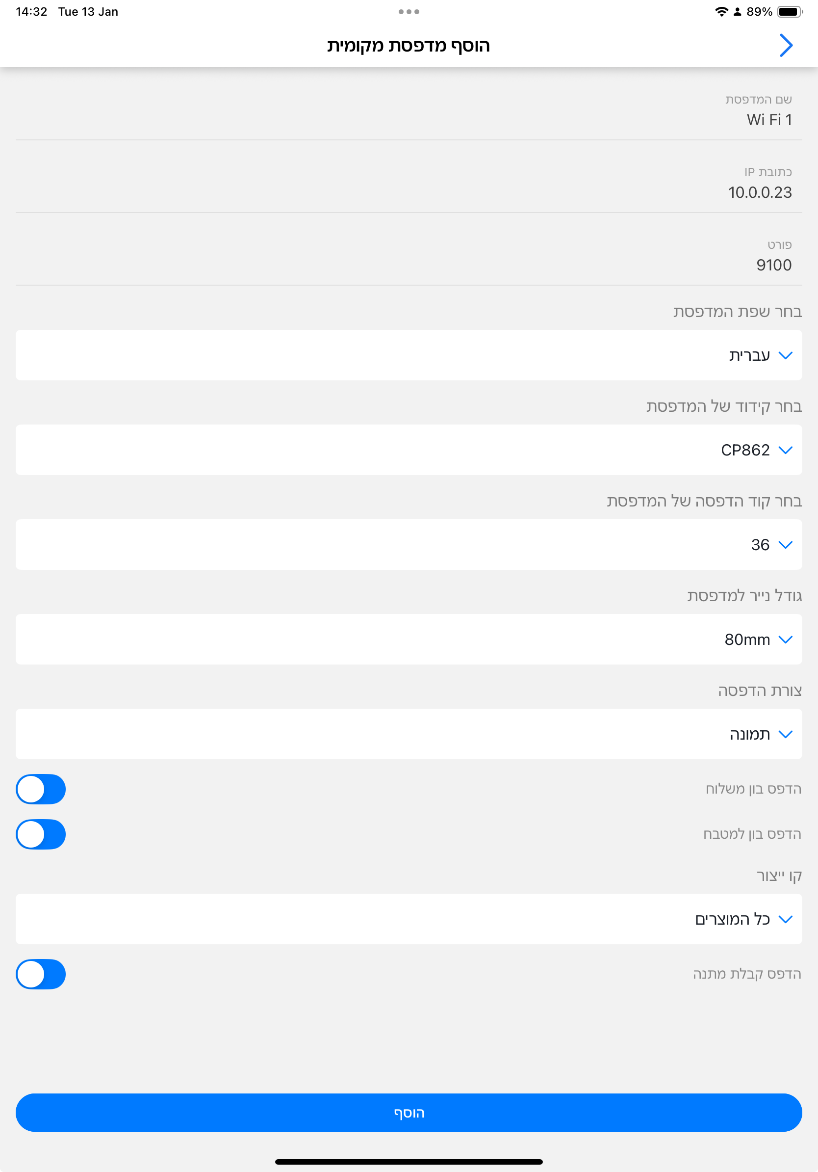 5.5. הוספת מדפסת Wi-Fi ב-DelivApp Business
