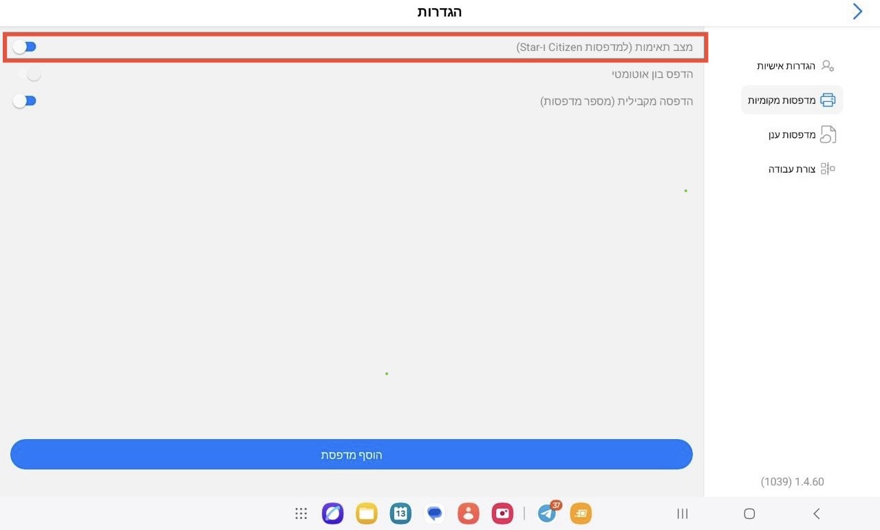 - למדפסות Citizen ו-Star — מצב תאימות חייב להיות כבוי;