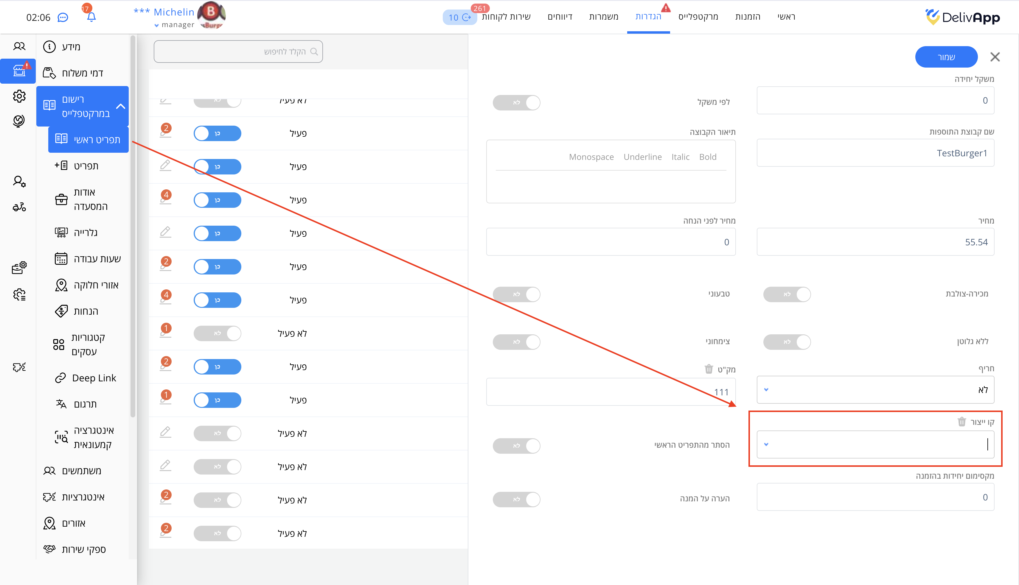 כדי להוסיף קו ייצור למוצר מתוך תפריט, יש להתחבר לפורטל כמנהל אדמיניסטרטיבי, ולאחר מכן: