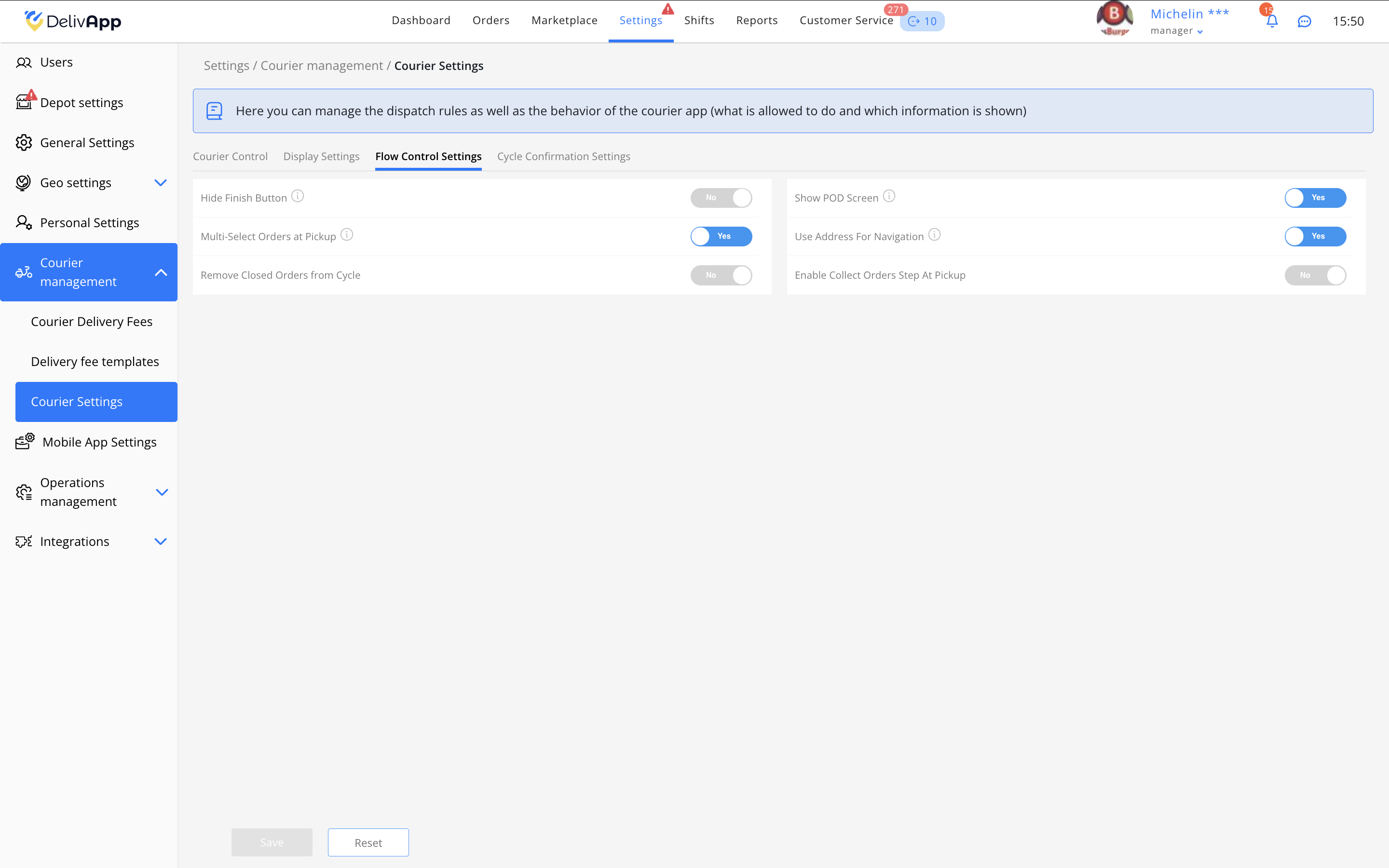 Опция Управление сменой только менеджером активирована — только администратор может включить или завершить смену курьера.