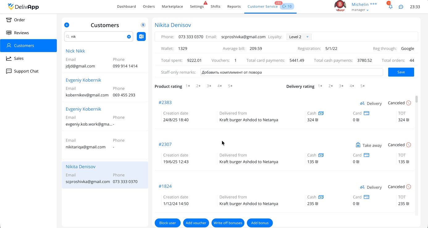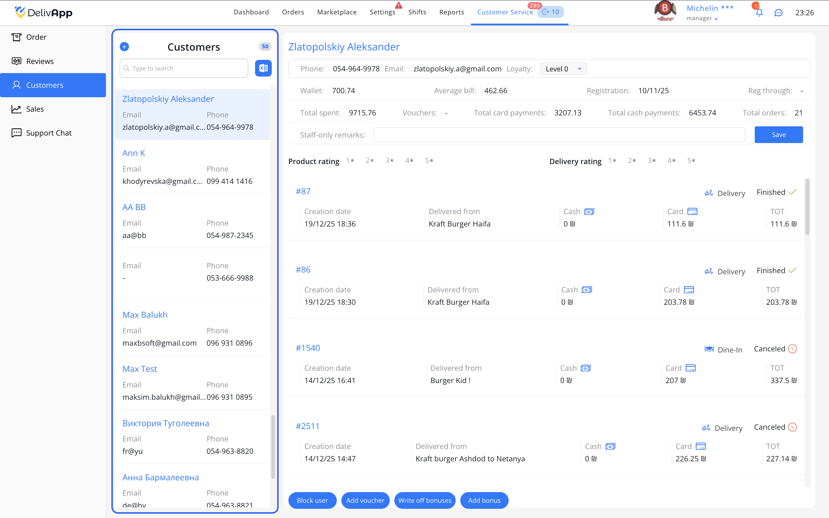 При нажатии на количество ваучеров открывается отдельное окно со списком всех ваучеров, назначенных клиенту. В этом окне оператор поддержки или владелец ресторана может: