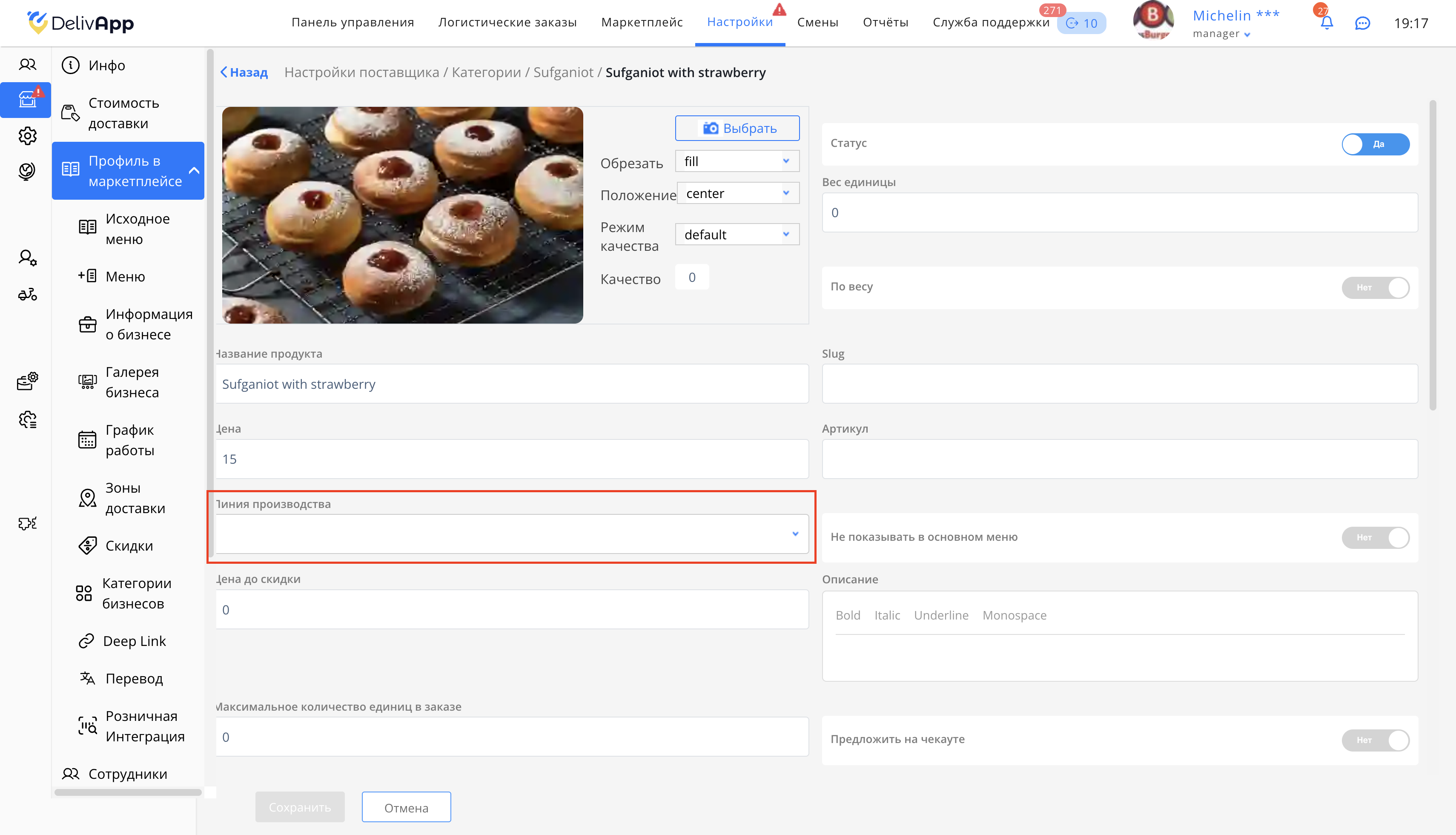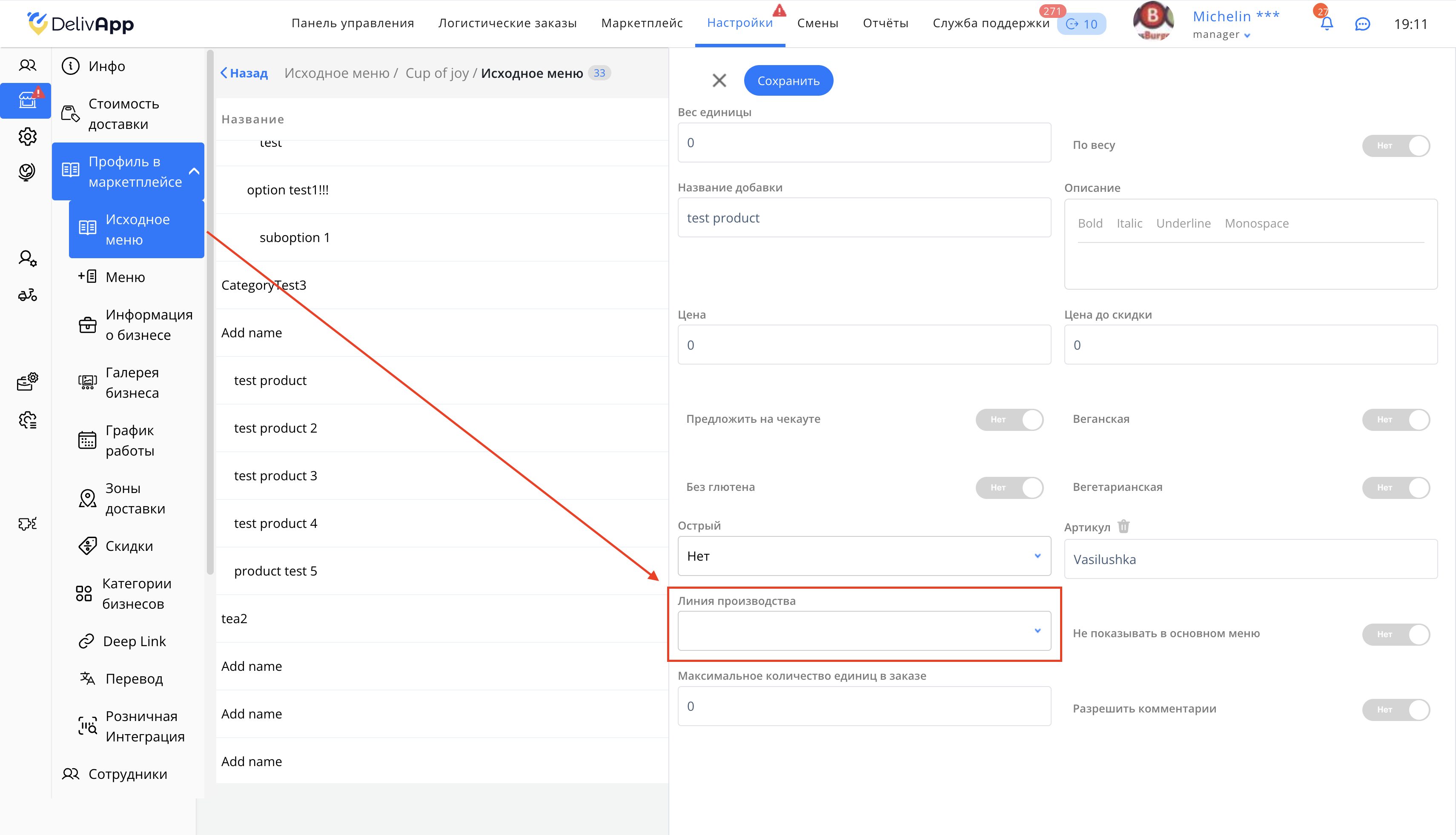 Чтобы добавить Линию производства для товара из Меню, необходимо залогиниться на портале под глобальным менеджером, далее: