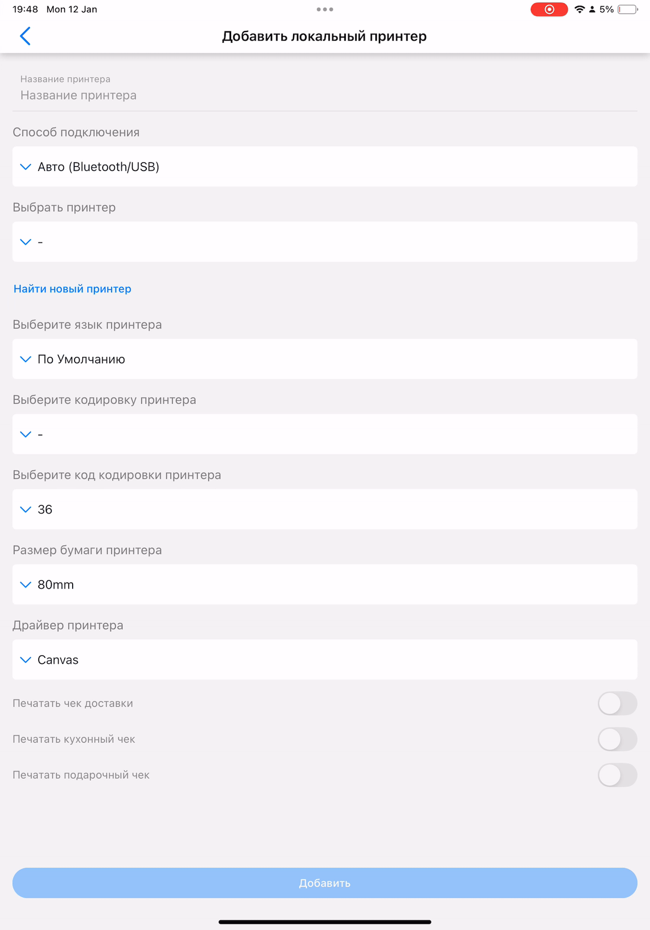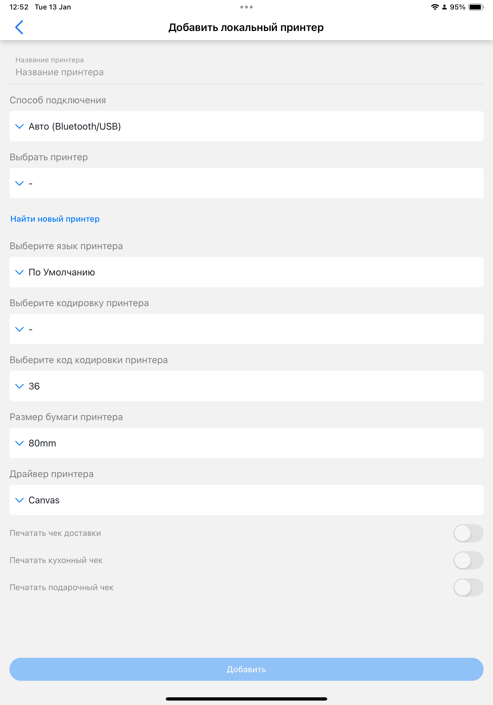 Далее описан единый алгоритм добавления принтера в приложении DelivАpp Business.